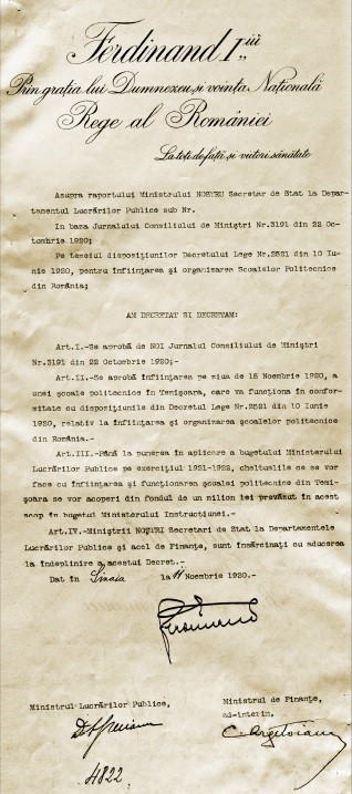 În acelaşi an, în data de 11 noiembrie 1920 este semnat de către Regele Ferdinand Decretul Lege privind înființarea, din 15 Noiembrie 1920, a „Şcoalei Politehnice” din Timișoara. Acestui monarh îi datorăm și memorabila frază rostită câțiva ani mai târziu şi care, între timp, a devenit deviza universităţii: „Nu zidurile fac o școală, ci spiritul ce domnește într-însa”.
